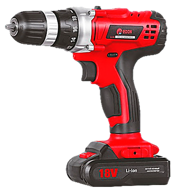 Дрель-шуруповерт аккумуляторная безударная Edon AD-18, предназначена для закручивания, отворачивания винтов и шурупов, сверления отверстий в различных конструкционных материалах (в том числе металле, дереве, пластмассе и т.д.)