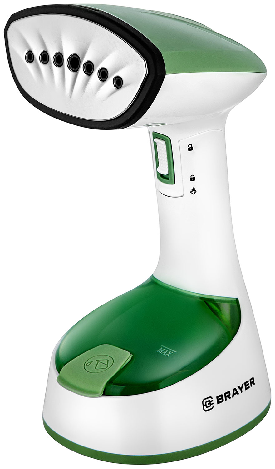Ручной отпариватель Brayer BR4128GN - максимальная мощность 1500 Вт, поверхность из нержавеющей стали с 7 паровыми отверстиями, складная ручка для удобного хранения, постоянный пар: 20 г/мин, вертикальное отпаривание, съемная щетка для лучшего разглаживания и удаления ворса.